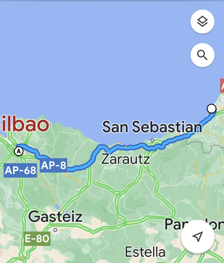 In Behobé overschrijden we de Spaanse grens. Via de kuststeden Orio, Getaria, Zumaia en Deba gaat het vervolgens naar Bilbao. We doorkruisen de stad in sneltempo. Overal lopen mensen in rood wit gestreepte t-shirts van Athletic Bilbao. De club, die uitkomt in de Primera Division, speelt vandaag tegen Girona. De politie is op de been en sommige straten zijn verboden terrein. Gelukkig geraken wij zonder omweg bij Autocaravaning Kobetamendi (https://www.campercontact.com/nl/spanje/la-rioja-26–pais-vasco-01-20-48/bilbao/10426/camperplaats-autocaravaning-kobetamendi.aspx). Deze camperplaats biedt ruimte aan 80 campers en heeft als extraatje een schitterend uitzicht op het centrum van Bilbao.