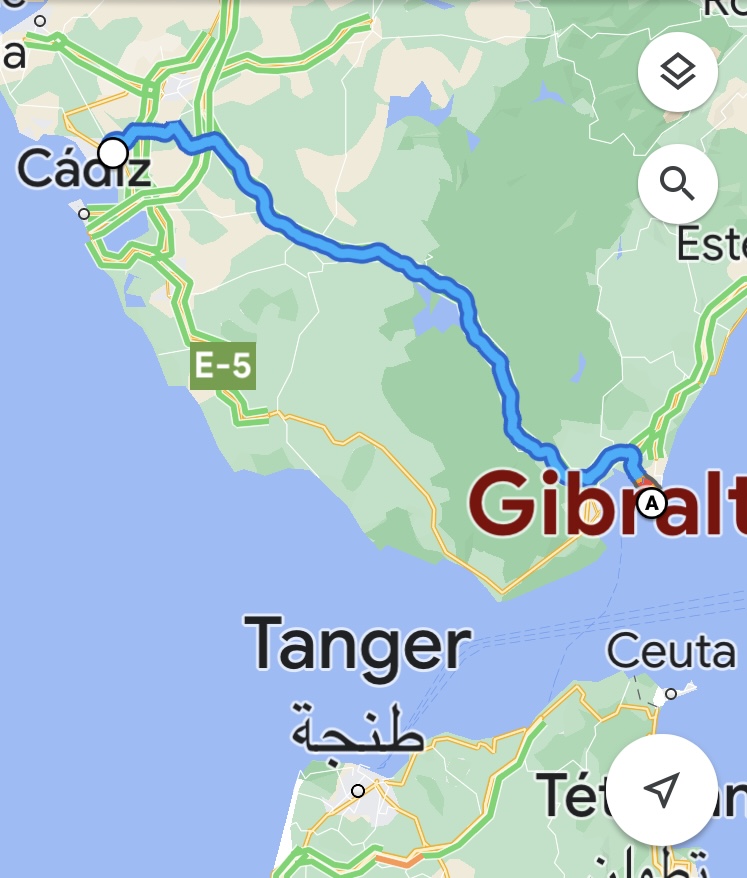 We bewonderen als eerste de Straat van Gibraltar. Dat is de zee-engte tussen Marokko en Spanje. Het is een indrukwekkend panorama. In de verte ligt het Afrikaanse continent. Op de foto is de landingsbaan, die doorkruist wordt door een autoweg goed te zien.