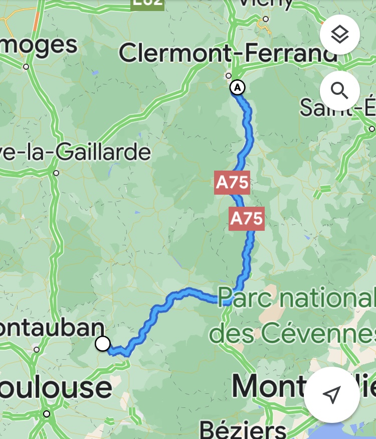 Het verkeer verloopt vlot. Nabij Clermont-Ferrand draaien we af naar Camping Huttopia Royat. De weg ernaar toe is een hel. De GPS stuurt ons langs zeer smalle straatjes met een stijgingspercentage tussen de 10% en 15%. Moeten stoppen en vervolgens oog in oog staan met een tegenligger is geen lachertje. Met klamme handen en een ei in de broek, lukt het nipt om niet achterwaarts de berg af te schuiven. De opluchting is groot bij aankomst op de camping. Maar die blijkt van korte duur. Op de receptie is niemand te bespeuren. Bij afwezigheid kan er aangebeld worden. Zo staat het geschreven op een A4-tje. Maar ook dan komt er niemand opdagen. We rijden noodgedwongen verder. Om dezelfde terugweg niet opnieuw hoeven te doen, draaien we de andere kant op. We belanden direct op een grote, goed berijdbare weg…