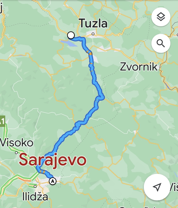 Vanuit Lucovac volgen we de M18 richting Sarajevo. Onderweg worden we achtervolgd door een politieagent op een motor die doet denken aan de serie Chips eind jaren 70. Net na het passeren van een groen verkeerslicht worden we aan de kant gehaald. De agent spreekt enkel Bosnisch en lijkt helemaal niet op Erik Estrada, de Chips-acteur. Volgens zijn handgebaren en gezichtsuitdrukking zijn we door een rood verkeerslicht gereden en gaat dit geld kosten. Zijn beschuldiging klopt in geen geval. We doen alsof we er niets van verstaan. Dat lukt zeer goed in Bosnië. De taal is veel te moeilijk. Na een minuut of 5 geeft de man het op. Zijn laatste woord is “oké”. Dat verstaan we als geen ander en weg zijn wij. Er is geen illustratie van onze ontmoeting, want het lef ontbreekt om een “groep-selfie” te vragen. Opgelucht gaan we weer op pad. In Stupari drinken we een Bosnisch koffietje. Daar kikkeren we van op.