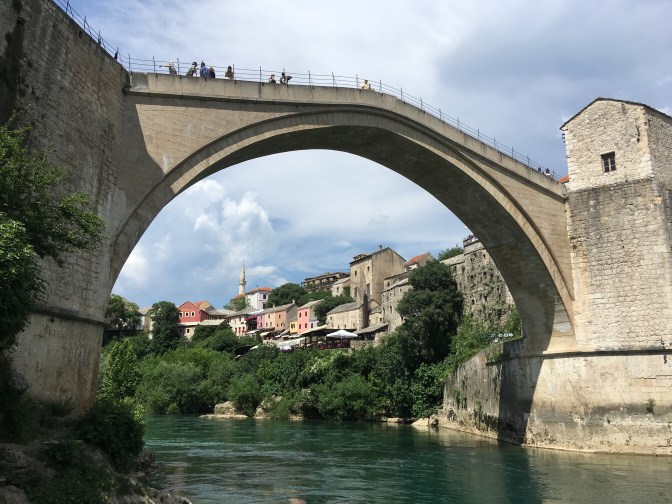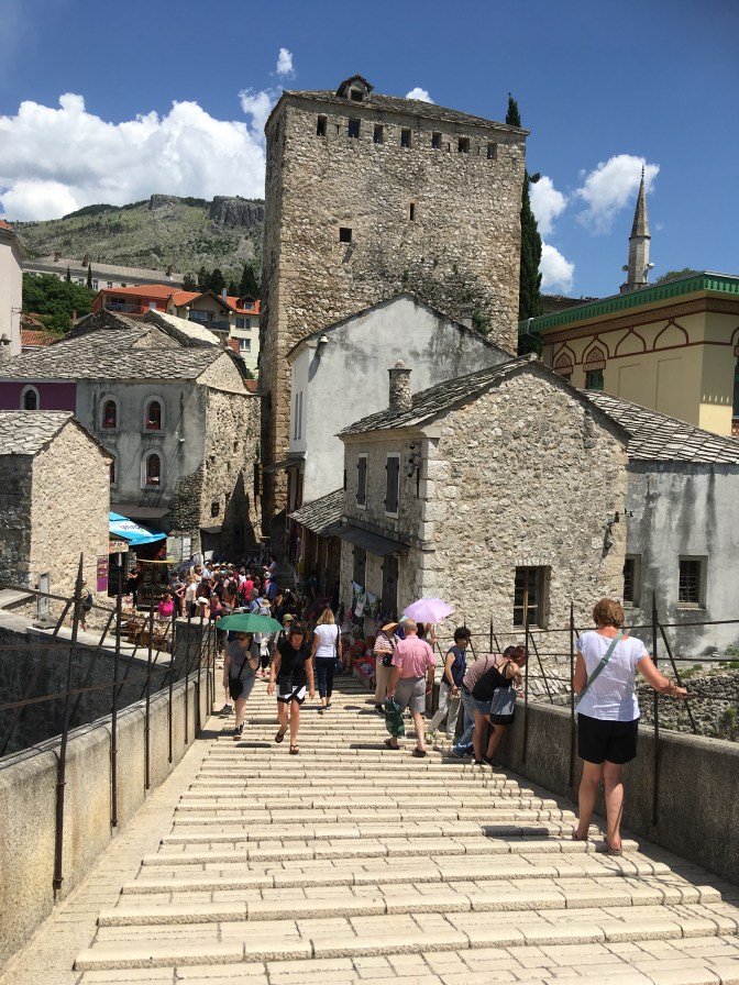 We nestelen ons meteen op een terrasje om het schouwspel te observeren. Het is een internationaal gebeuren. De meeste Aziatische toeristen zijn consequent gekleed in lange broek en t-shirts met lange mouwen. Velen zijn voorzien van paraplu’s of dragen zonnekleppen in verschillende modellen en maten. Ook de Europese toeristen lopen in de kijker. Degenen die in groep reizen volgen de gids, die vooraan loopt met een opgestoken vlaggetje van het land van herkomst. De taal die de gids spreekt, verraadt de verschillende nationaliteiten. De Europeanen zijn veelal lichter gekleed en verspreiden een lichte geur van zonnecrème. De selfie-sticks zijn de internationale gemene deler. Iedereen zeult ermee rond. We kuieren door de autovrije, smalle straatjes van de stad, eten een ijsje, drinken een biertje en doen aan window-shopping, weliswaar zonder selfie-stick. Wie de toeristenstroom volgt, komt automatisch bij de wereldberoemde brug van Mostar.