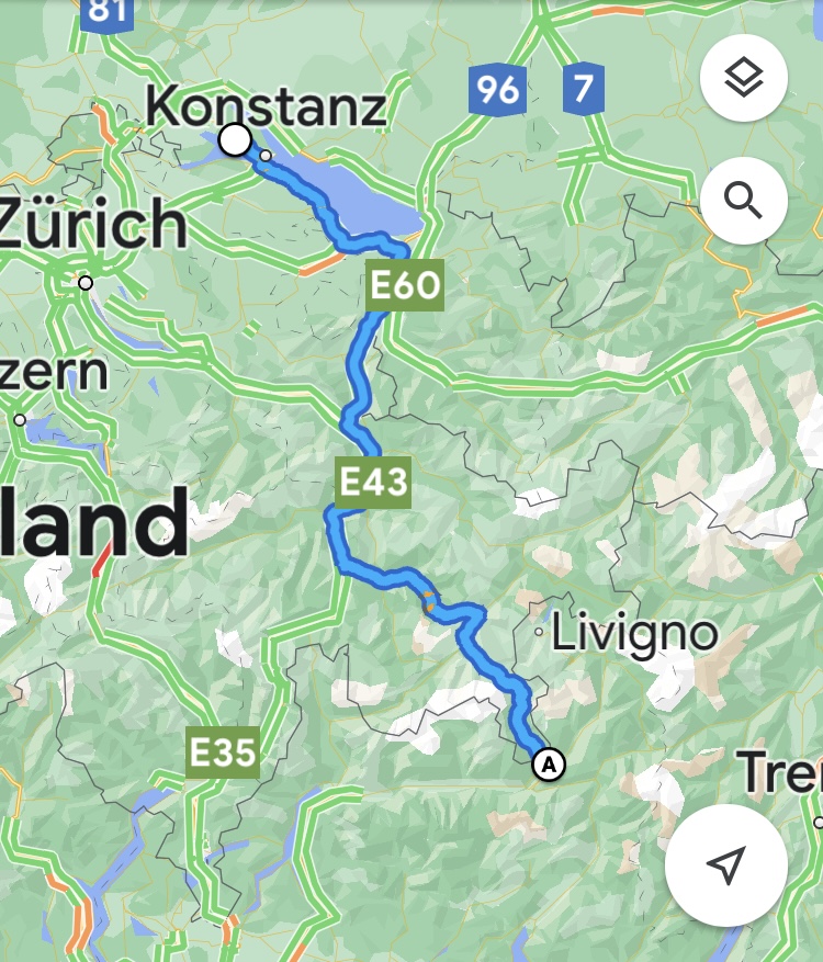 De dag start met een dilemma. Tolwegen of niet? We willen naar Sirmione, een gemeente in Italië aan het Gardameer. De afstand bedraagt 486 km. Met tolwegen duurt de reistijd 4,5 uur, zonder 7,5 uur. Om aan het Gardameer te geraken moeten we Zwitserland doorkruisen. Een tolvignet kost 35 € en is een jaar geldig. Via de snelwegen gaat het sneller, maar het is saaier. We kunnen net zo goed trager reizen en genieten van het Zwitserse landschap. Wellicht geraken we dan niet in Sirmione. Na wat wikken en wegen kiezen we voor traagheid. We rijden de Zwitserse bergen tegemoet.