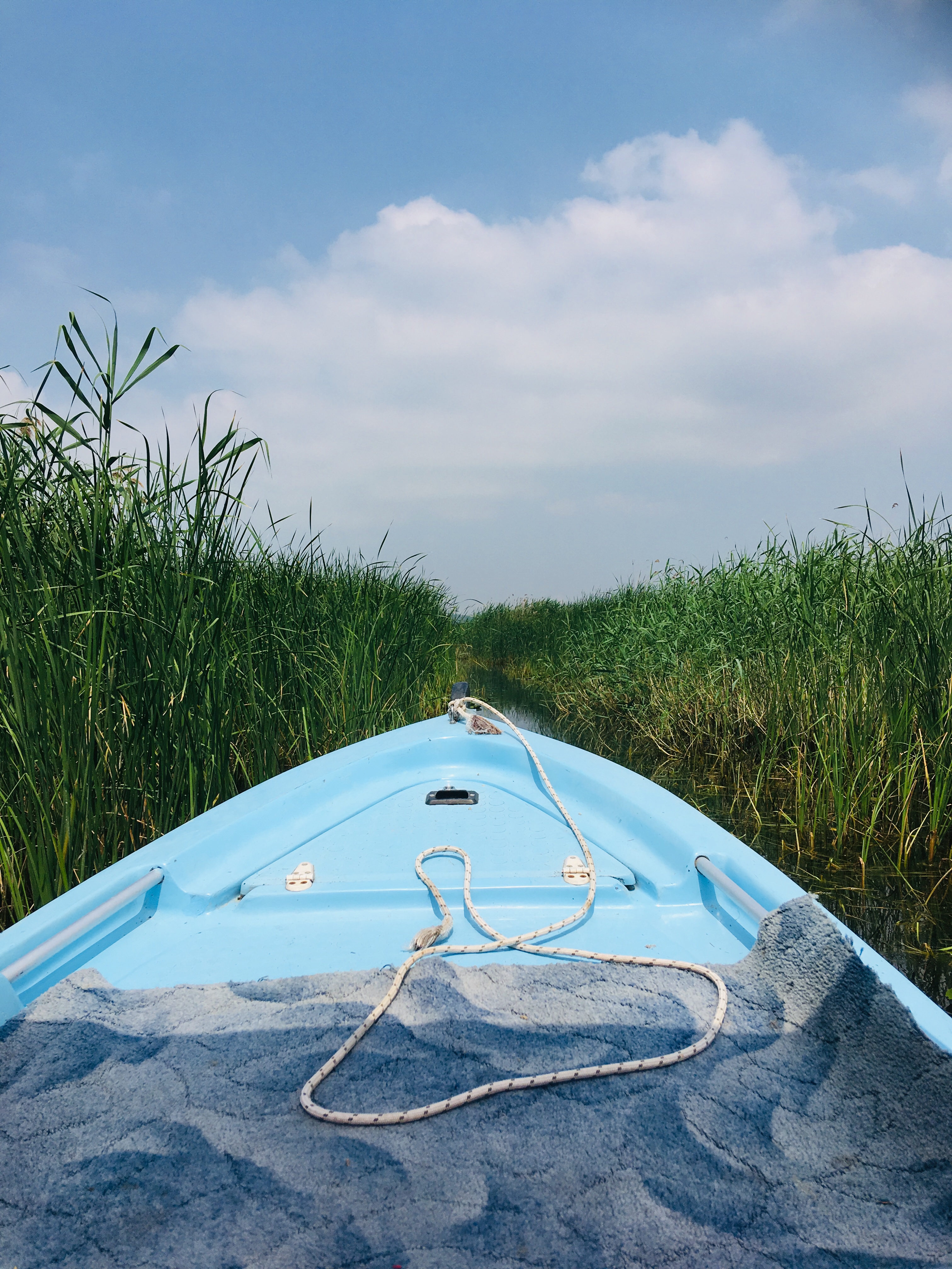 Naast de vliegende beestjes zijn er ook zwemmende soorten. Af en toe kronkelt er een waterslang aan de oppervlakte. Ik ben niet snel genoeg om er eentje te portretteren. Het bootje vaart rond Golyazi en keert dan terug naar de parking.