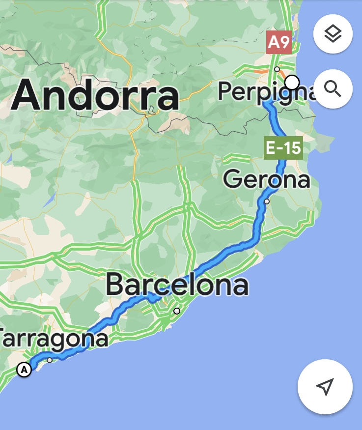 Het is een lastige onderneming om resoluut tolwegen te vermijden. Cambrils is de eindbestemming. De GPS geeft een rijtijd aan van 6,5 uur zonder tolwegen. Google Maps op de GSM slechts 4 uur. De GPS manipuleren door tussenstops in te lassen lukt niet en het telefoonscherm is te klein voor “leesbril-ogen”. De route stuk voor stuk instellen lukt misschien wel. Het eerste eindpunt is Olot. Na 103 km bereik ik de stad, maar dan is het al 3 uur later. Op deze manier wordt Cambrils bereiken voor het donker onmogelijk. Tot mijn scha en schande is de tolweg de enige uitweg. Het verdict valt uiteindelijk mee. De autoweg van Begudà richting Barcelona is voor een groot stuk tolvrij. Enkel de laatste 100 km kosten me 11 €.