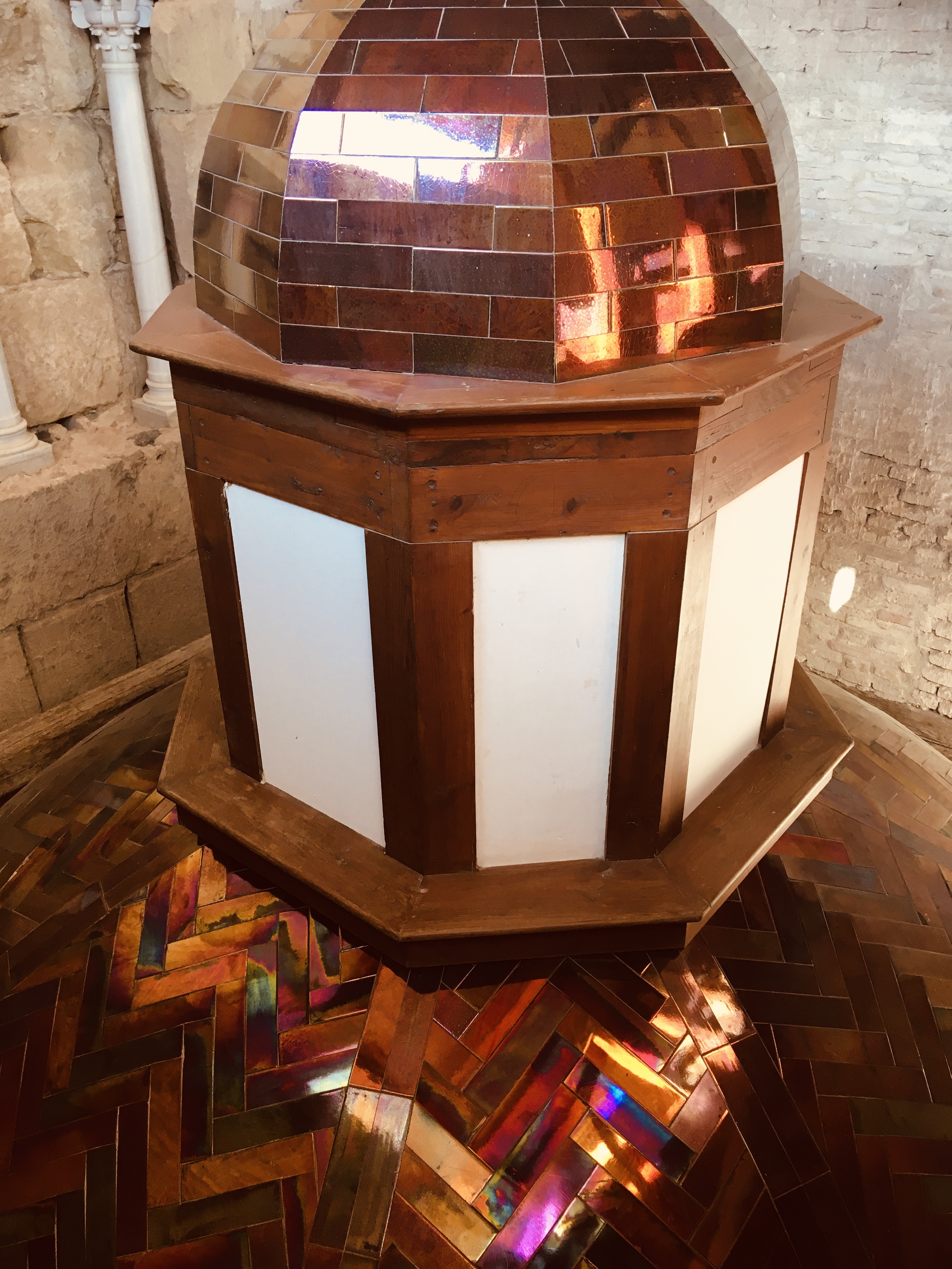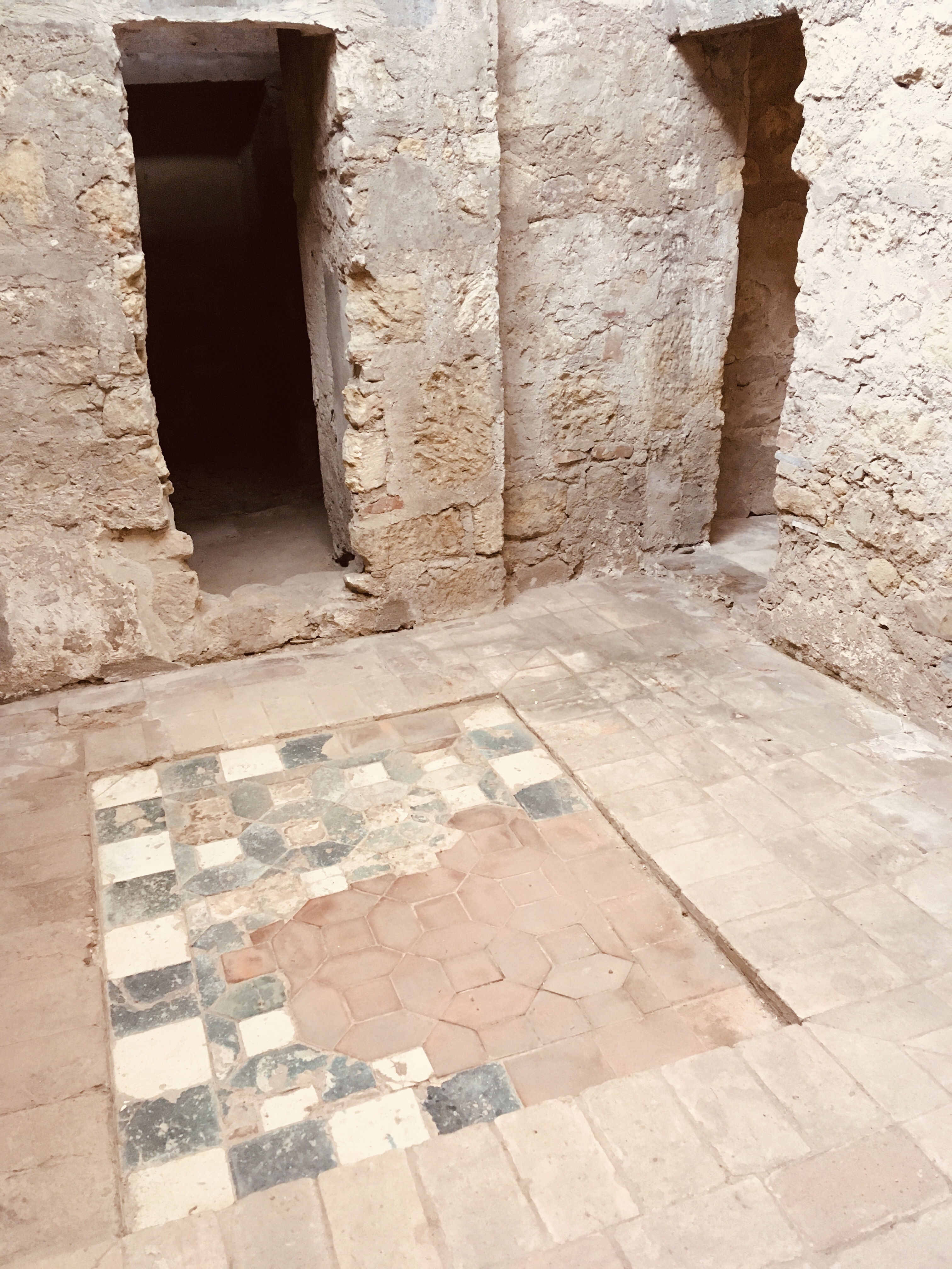 Als ik na het bezoek aan de voormalige moskee en de klokkentoren de stadswandeling verderzet, zie ik een bord met een verwijzing naar het oude badhuis van het kalifaat Alcázar. Het is een klein, ondergronds museum met de restanten van de oude badhuizen uit het Moorse tijdperk. De inkomprijs bedraagt 3 €, maar ik heb geluk. Het papier om de toegangstickets af te drukken is net op. De man aan de kassa zucht eens diep en verleent me vervolgens gratis toegang.