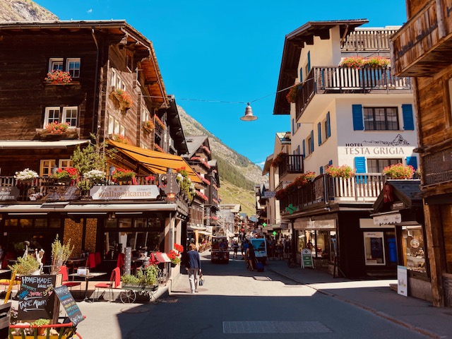Het middelpunt van Zermatt is een aaneenschakeling van terrassen, hotels en winkels van bekende merken. Een glimp in de etalage van Rolex leert ons dat een simpele horloge tot 19.000 CHF kost. Een kleine optelsom vertelt me dat de prijs gelijk staat aan zo’n 1,5 jaar reisplezier. Dan maar niet…