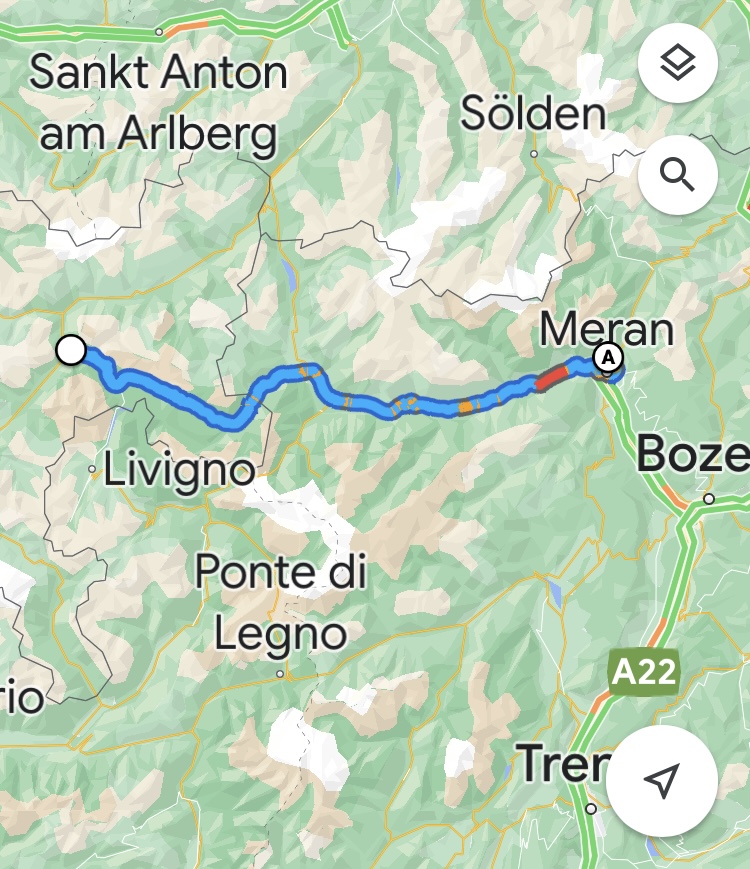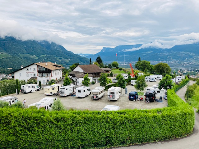 De campings in Noord Italië moeten qua prijs niet onderdoen voor hun Zwitserse collega’s. De meeste kampeerterreinen hanteren een prijs van meer dan 40€ per nacht. Dat is te veel van het goede. Ik overnacht op Camper Stellplatz Schneeburghof (https://www.schneeburghof.com/) in Tirolo, vlakbij de mooie stad Merano. Het is een uitstekende camperplaats met alle voorzieningen tussen de appelgaarden. De mooie omgeving in de bergen is een surplus. Er is zelfs een zwembad. Hoewel de temperatuur in Tirolo goed zit, is het toch te fris om erin te duiken..