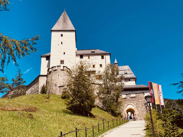 Wachten betekent niet noodzakelijk stilstaan. Het geeft me de tijd om Mauterndorf te verkennen. Mauterndorf is een klein stadje met net geen 2000 inwoners. Het heeft zijn naam te danken aan de handelsroute uit de 13de eeuw. Alle handelaren die Burg Mauterndorf passeerden moesten er tol betalen op de waarde van hun goederen. Maut is het Duitse woord voor tol. Het kasteel is dagelijks te bezoeken in de zomermaanden. Het ligt amper 600 m van Haus Katris en met de LungauCard die Katy me gisteren bezorgde, is de entrée zelfs volledig gratis. In corona tijden zijn mondmaskers verplicht.