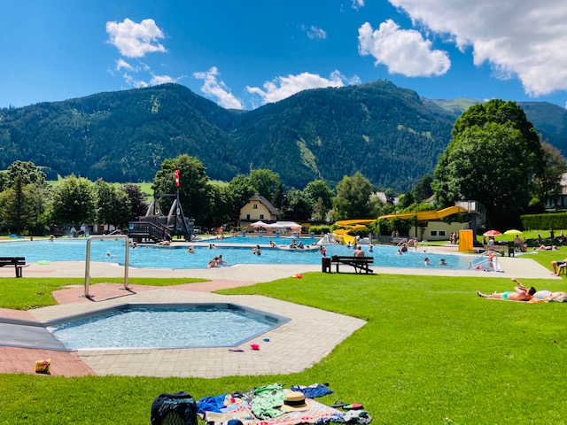 Na de geschiedenisles is het tijd voor ontspanning. De temperatuur is opgelopen tot 26 graden en een frisse duik is welkom. Het toeval wil dat het stadje over een schitterend openluchtzwembad beschikt met uitzicht op de hoger gelegen bergen. Het veelzijdige waterpark is omringd door groene graspartijen die uitnodigen om te relaxen in de zon. Met dit mooie weer is er geen betere plek om te vertoeven. Met een boek, een handdoek en de onmisbare LungauCard in aanslag trek ik er naartoe om enkele uren niets te doen. Het is eindelijk bikini tijd. Ook hier is de toegang volledig gratis.