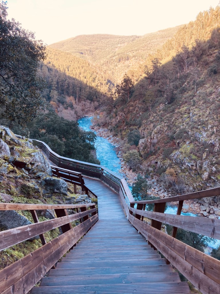 Naast het parkeerterrein is een bar onder een houten afdak. Ik spoel de doorstane beproeving door met een warme tas koffie en raak meteen aan de praat met een vriendelijke jongeman die vlot Frans spreekt. Op 5 minuten tijd hebben we een deal voor vervoer naar Areinho. Een langgerekte houten loopbrug tussen de 2 dorpen Areinho en Espiunca vormen de Paiva wandelpaden. Vervoer naar Areinho is een goede zaak. Op het einde van de wandeling ben ik gelijk weer thuis. Het wandeltraject is officieel 8,7 km lang en staat voor een matig, uitdagende wandeling langs de linker oever van de Paiva rivier. Vanaf de autoparking in Areinho is het zo’n 1,5 km trapsgewijs stappen naar de officiële ingang. De kostprijs van een ticket is 2€ en kan via internet besteld worden. Oeps, een vergetelheid. Ik ben ook nog eens 10 minuten te laat op de afspraak. Het laatst mogelijke vertrekuur in de winterperiode is 14.00 uur. Er is weinig overredingskracht nodig om de loketbediende te overhalen om me toch toe te laten. Na een telefoontje naar zijn baas en het meten van mijn lichaamstemperatuur mag ik eraan beginnen.