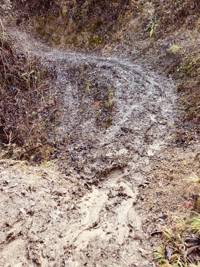 Het mega gladde parcours brengt me aan het twijfelen. De ondergrond is glad, smal en overal oneffen. Het is klauteren geblazen over rotsblokken en omgevallen boomstronken. Terugdraaien of niet is de vraag die meermaals door het achterhoofd speelt. De foto’s en filmpjes op YouTube die hangbruggen en betonnen muurtjes tonen, houden me op de been.