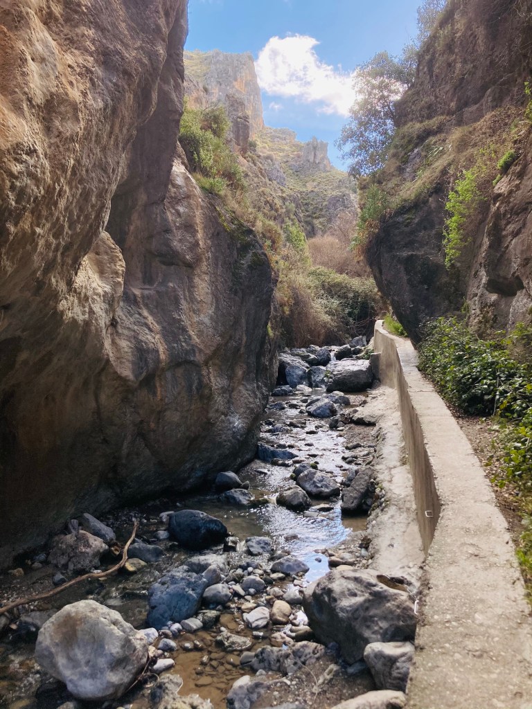 Helemaal bovenaan is het meest avontuurlijke achter de rug. Er volgt nog een 2,5 km lange afdaling over een min of meer verharde weg tussen boerderijen en landerijen naar het dorp. De Los Cahorros wandeltrip vormt een ronde cirkel. Het is mogelijk om in beide richtingen te starten. Ik vind enkel routebeschrijvingen die beginnen aan mijn eindpunt. Maar dat zal wel aan mij liggen.