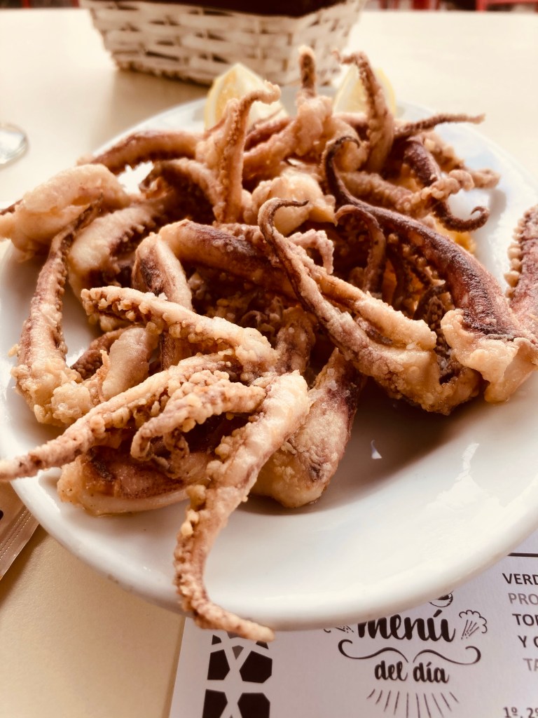 Het dorp Monachil heeft een oranje kleurcode op de coronakaart. Alle terrassen van bars en restaurants zijn geopend tot 18 uur. Dat is een meevaller. Na de inspanning volgt ontspanning. Ik geniet na van gefrituurde inktvis en een glas witte wijn in El Kiosko in het dorpscentrum.