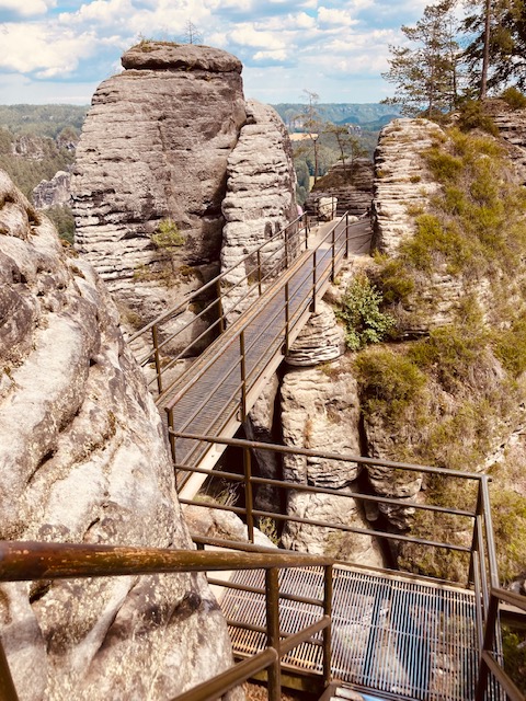 De Bastei is een toeristische topper in deze regio en dat is te zien. Om de Bastei Brücke te bereiken moet je langs het Berghotel Bastei, een gastronomisch restaurant, enkele souvenirwinkels en terrassen. Er is veel volk op de been. De Bastei Brücke werd 200 jaar geleden gebouwd om de rotsformaties beter bereikbaar te maken voor toeristen. Oorspronkelijk was het een houten brug die later verstevigd werd. Het is een van de weinige bruggen die puur voor het toerisme werd opgetrokken. De boogbrug heeft een lengte van 76 meter en overspant een 40 meter diepe kloof.