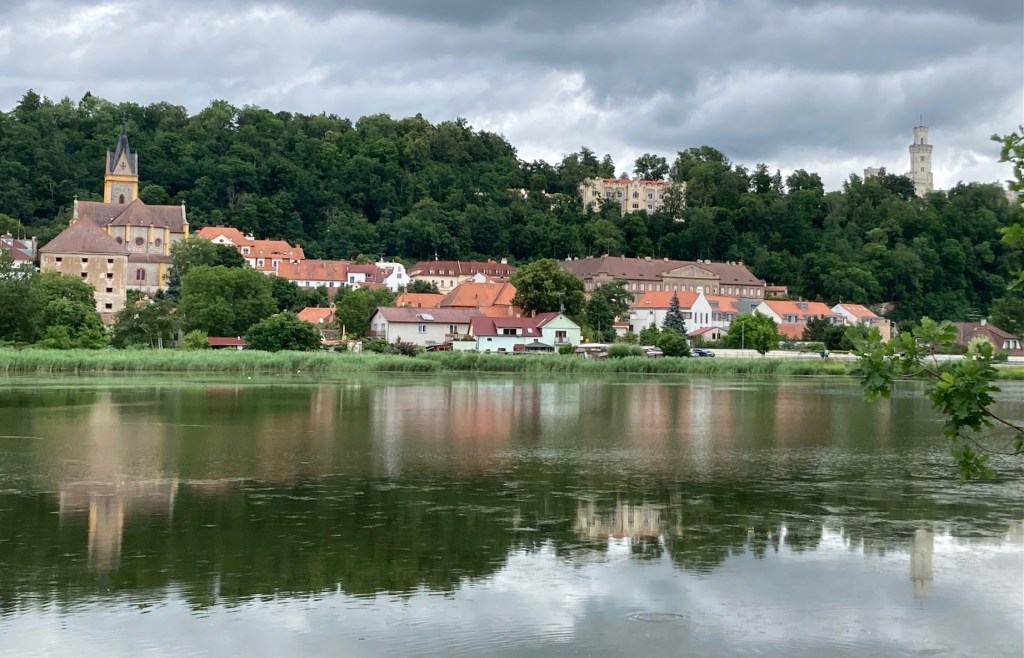 Na de oversteek van een laatste drukke rijweg, gaat de route verder via een wandelpad langs het water. Hluboká nad Vltavou ligt aan de overkant. De hoogste toren van de vesting is dan al zichtbaar in de verte, rechts op de foto.