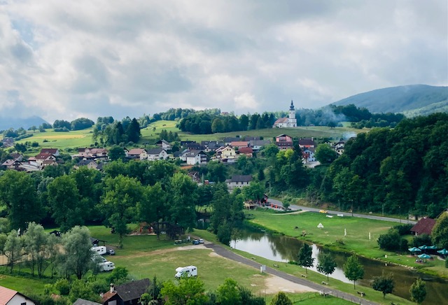Ik ben per ongeluk aanbeland in Žužemberk, een Sloveens dorp met slechts 1100 inwoners. Op het grondgebied staat Grad Žužemberk, een middeleeuws kasteel met 7 grote verdedigingstorens. Het pittoreske slot staat op een klif naast de Krka rivier. Na eeuwen van bewoning en talrijke tragedies werd er uiteindelijk een rechtbank gehuisvest tot 1893. Nadien begon het verval en de 2de wereldoorlog deed er nog een schepje bovenop. De geallieerden bombardeerden de ruïnes in 1945. De renovatiewerken starten 20 jaar later en duren nog steeds voort. Het fort is gratis te bezoeken. De torens bieden een panoramisch uitzicht op de rivier en het omringende landschap. Naast het kasteel is een restaurant en aan de overkant een bakker. De bakker komt als geroepen…