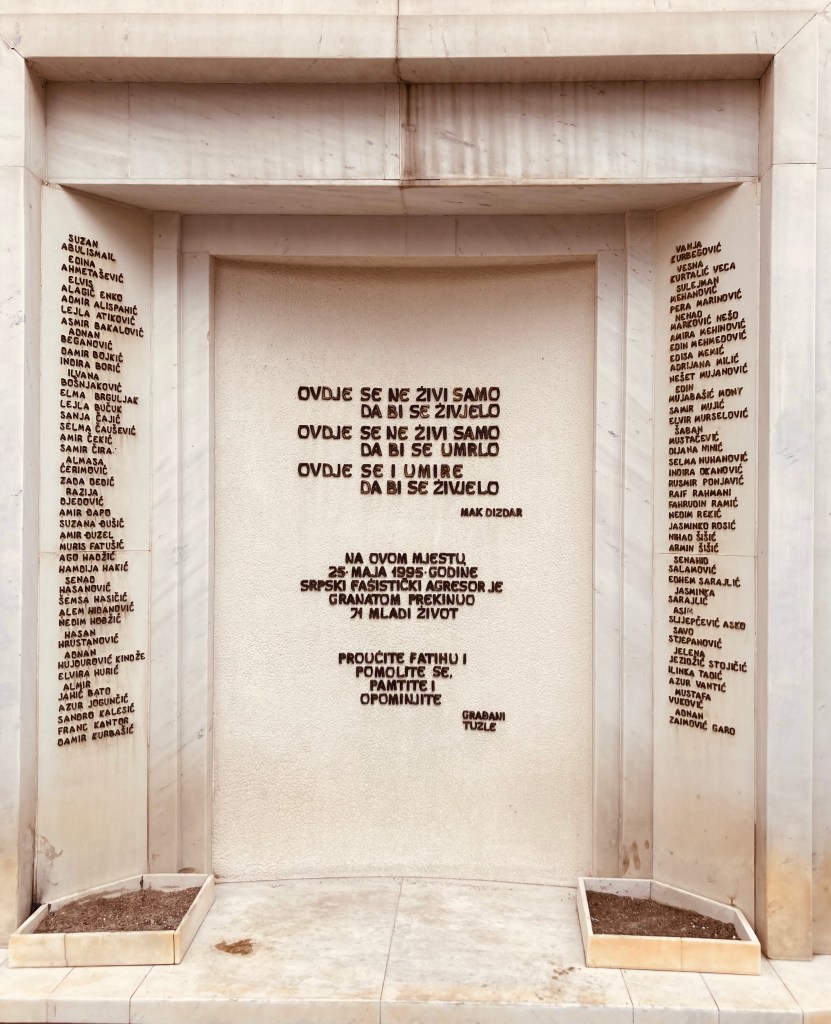 Tuzla heeft jammer genoeg ook een oorlogsverleden. Het monument voor de moskee is ter herdenking van de genocide tijdens de laatste burgeroorlog. Alsof dat nog niet genoeg was, volgde er op 25 mei 1995 een granaatinslag op een drukke voetgangerskruising aan Café Kapija. Er vielen 72 slachtoffers en 240 gewonden. Op de plek waar vroeger de deur van het café was, staat nu een monument met alle namen van de slachtoffers.