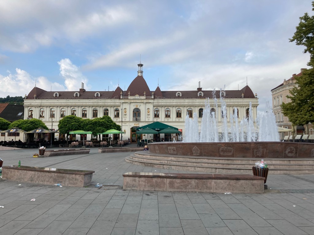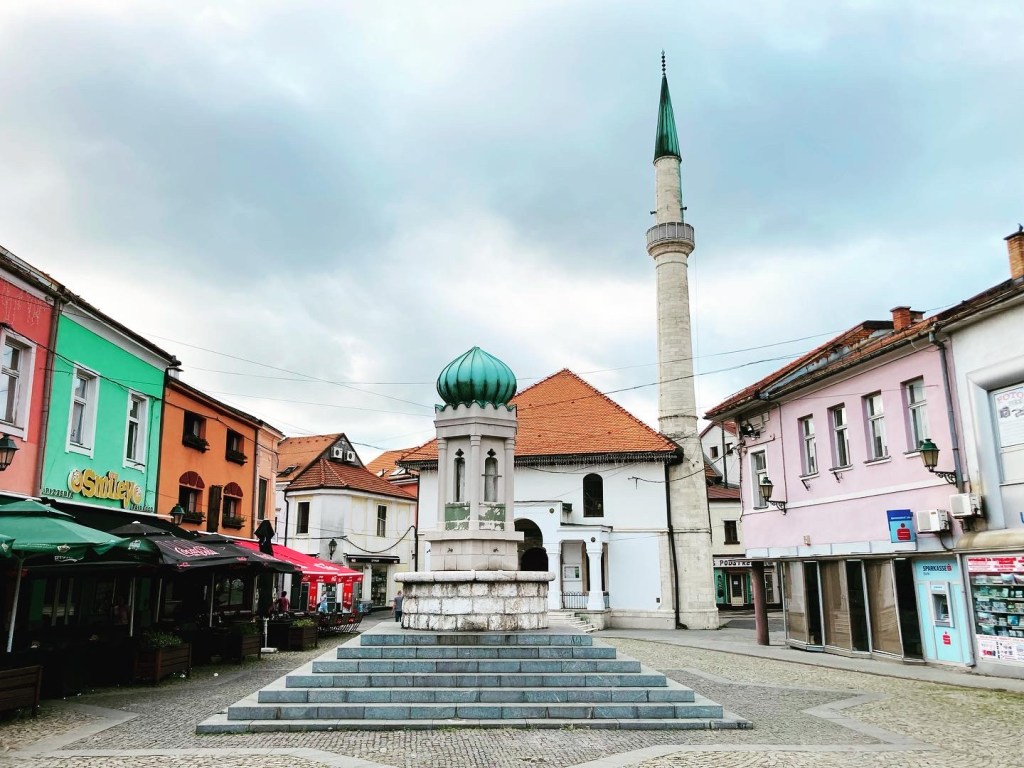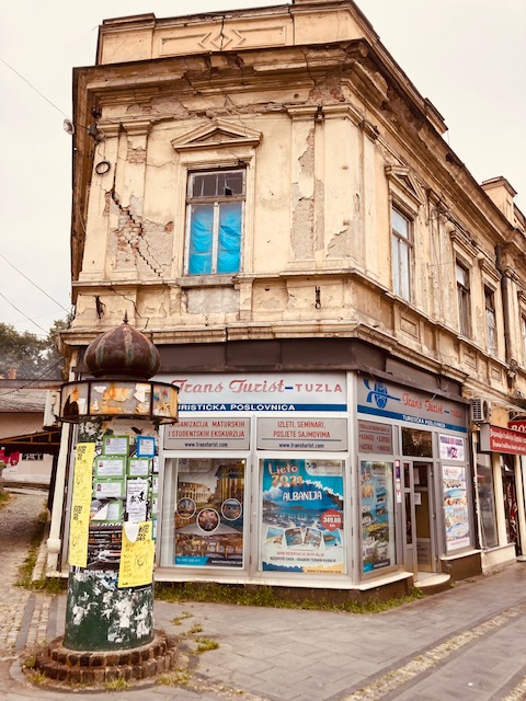 Meliha is een uitstekende gids en laat ons kennismaken met het gezellig centrum dat ’s avonds helemaal tot leven komt. De stad is autovrij en staat vol met oude kleurrijke panden. Het contrast is groot. Sommige huizen zijn vervallen als gevolg van verzakkingen door de vroegere zoutwinning, anderen zijn volledig gerenoveerd. Het grootste plein is het Trg Slobode met in het midden een fontein en een replica van het helemaal ineengezakte oude Habsburgse gebouw uit een van de vorige eeuwen.