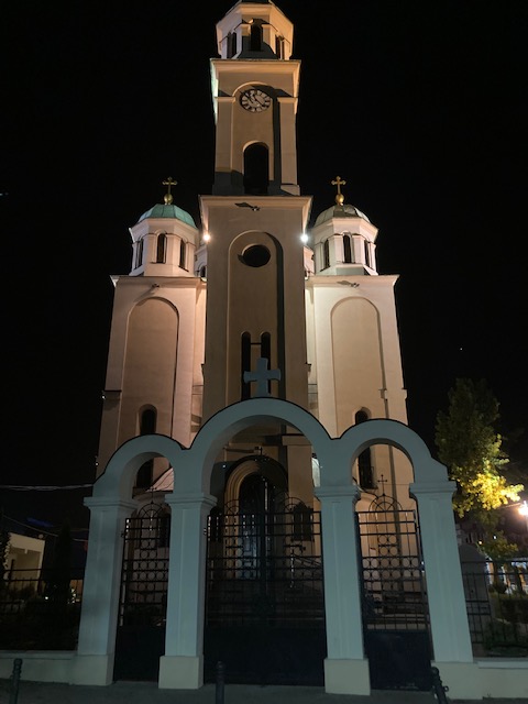Aan de rand van het stadspark staat een mooie Orthodoxe kathedraal die in de avonduren extra verlicht wordt. Die merken we op als we na een leuke avond in het gezelschap van Meliha terugkeren naar de bus voor de nacht.
