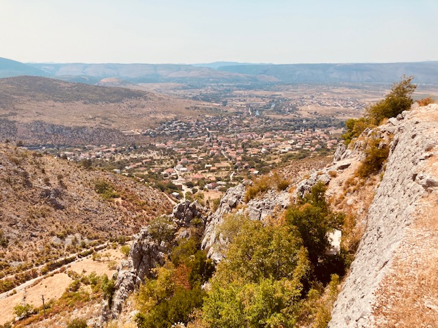 Blagaj ligt in een vallei en die zie je op zo’n 10 km afstand liggen vanop de route. Ik stop om een foto te nemen en probeer Camping Mali Wimbledon te lokaliseren vanop grote hoogte, maar dat lukt niet.
