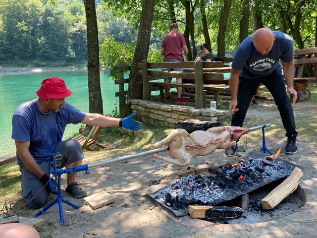 Daarna gaat de reis verder naar Foča. Het is telkens een plezierige ervaring om op Camping Drina (https://www.autocampdrina.com/en/home) te verblijven. Deze kleinschalige familiecamping is een paradijs om te raften, te hiken, te socializen met andere gasten en… te eten. Vader Branko heeft zijn strepen verdiend met het grillen van vlees en forel boven een open houtvuur en ik kijk er naar uit om al dat lekkers naar binnen te spelen. Deze keer heeft hij iets anders in gedachten. Johan, een van de Nederlandse gasten “smeekt” al enkele dagen om een speenvarken aan het spit, een van de Bosnische culinaire tradities. Vandaag krijgt hij zijn zin. In ruil moet hij helpen met de bereiding maar dat vindt de man leuk. Bij mijn aankomst hangt het arme dier net aan het spit.