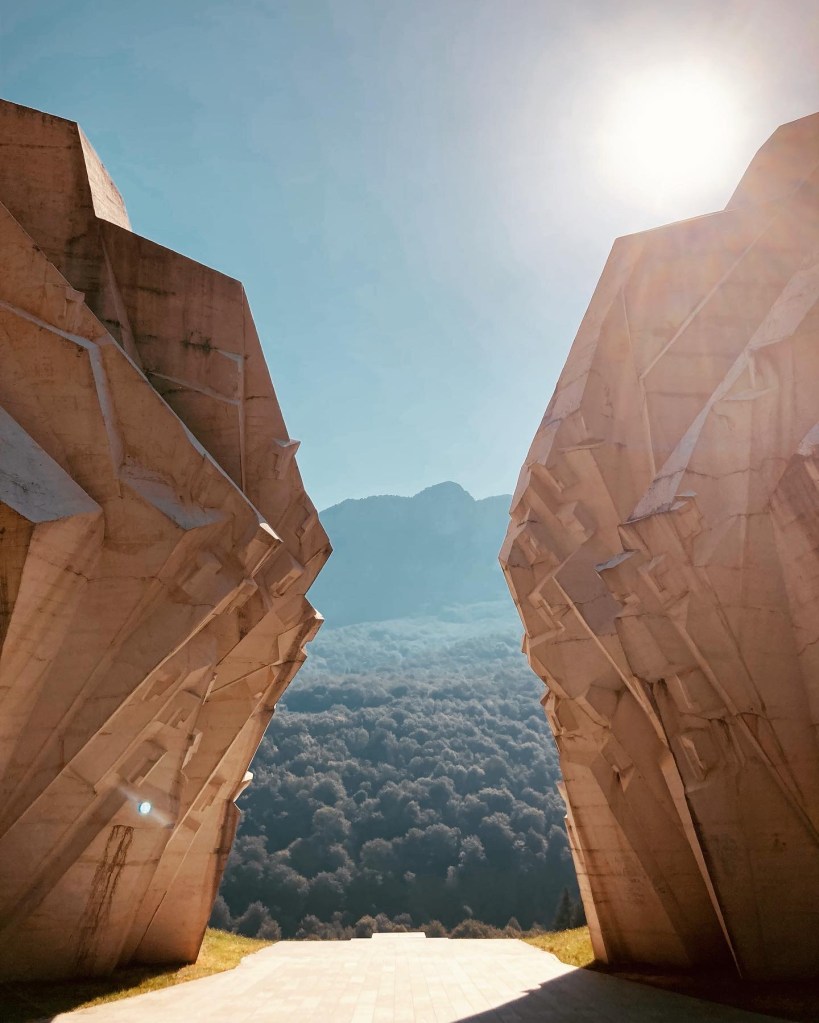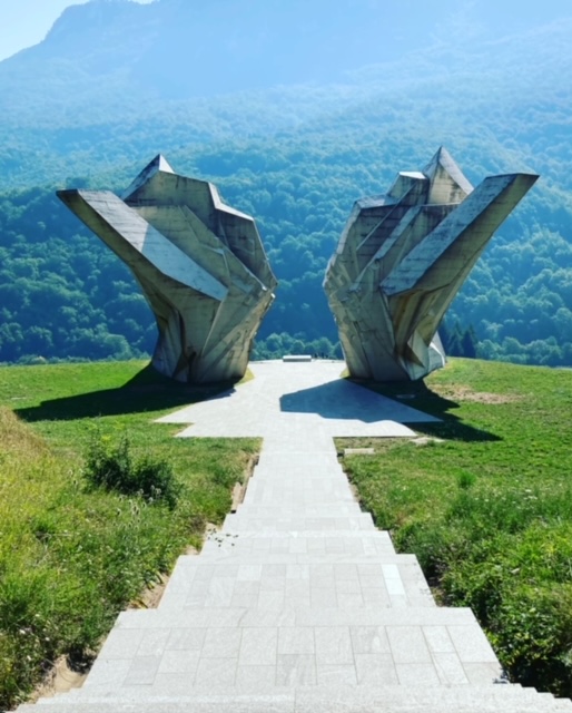 Om naar Blagaj te rijden, neem ik een onbekende route. De M20 loopt dwars door het Sutjeska Nationaal Park. De smalle en af en toe in slechte staat verkerende weg loopt dwars door de ongerepte natuur. Het is geen echte bergcol maar wel een leuke rit met hellingen, afdalingen en bochten. Ik stop aan de niet te missen hotspot in Tjentiste. Hier staat een heel speciaal oorlogsmonument met de naam “Vallei der Helden” en een klein museum dat op maandag gesloten is. Het monument werd in 1971 gebouwd en herdenkt de Slag van Sutjeska uit de 2de wereldoorlog. De veldslag duurde van 15 mei tot 16 juni 1943. Het was een ongelijke strijd. De Duitsers en hun bondgenoten waren met 127.000 manschappen tegenover 18.000 partizanen. Toch slaagde het Joegoslavische leger erin om de omsingeling te doorbreken. Er vielen 8000 doden waaronder veel soldaten maar ook een groot aantal burgers. Omdat de operatie “Fall Schwarz” zoals de Duitsers die noemde faalde, werd deze veldslag als een keerpunt gezien in de 2de wereldoorlog. Het gedenkteken staat op een heuvel en om vlakbij te komen, moet je een aanzienlijke hoeveelheid trappen overbruggen.