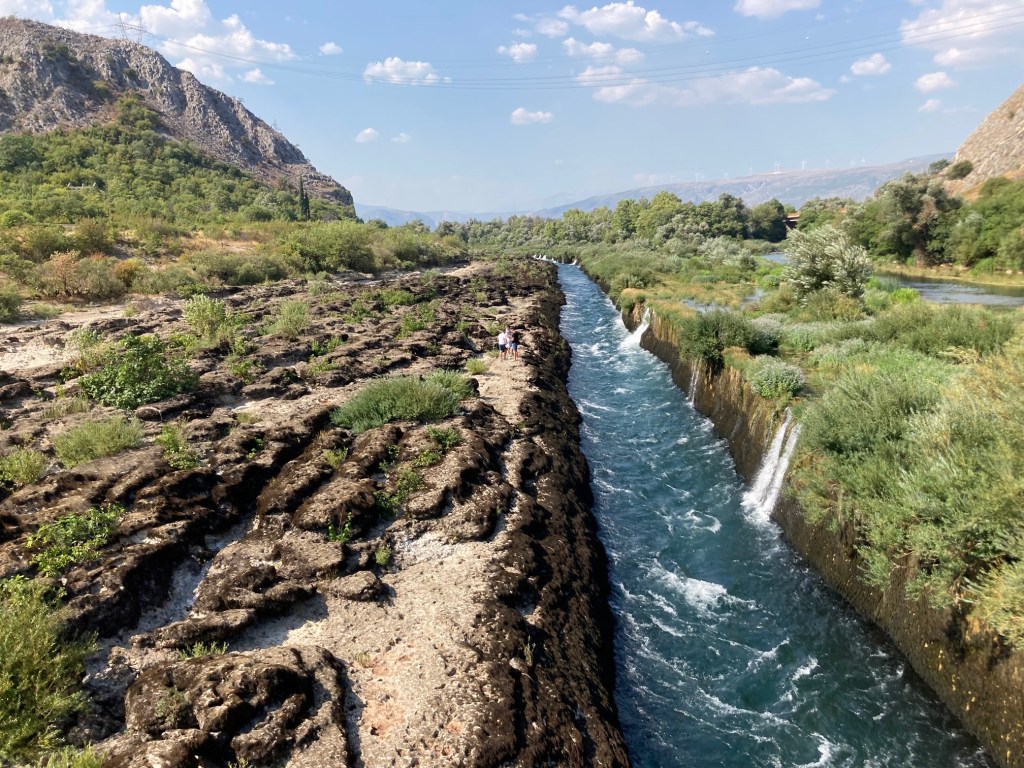 In Zitomislici heb ik afgesproken met Jelle Scherpereel. Deze Belg en duivel-doet-al woont en werkt al 12 jaar in Bosnië-Herzegovina, spreekt de taal en helpt toeristen een leuke tijd beleven tijdens hun reis door dit mooie land. Jelle heeft vanavond een fietstocht geregeld langs het Bunski Kanal en de oude spoorlijn. De man is een fervent fietser en neemt me op sleeptouw op zijn zondagse fietstocht. Als dat maar goed komt. Ik heb geen fiets meer aangeraakt sinds mijn vertrek uit België en dat is ruim 6 weken geleden. Bovendien is het in Mostar al enkele weken bijna 40 graden. ’s Avonds koelt het wel wat af, maar het blijft warm. Het Bunski Kanal is een oase van natuurlijke grachten in de omgeving van Mostar. Dit pareltje ligt verborgen naast de drukke M17.