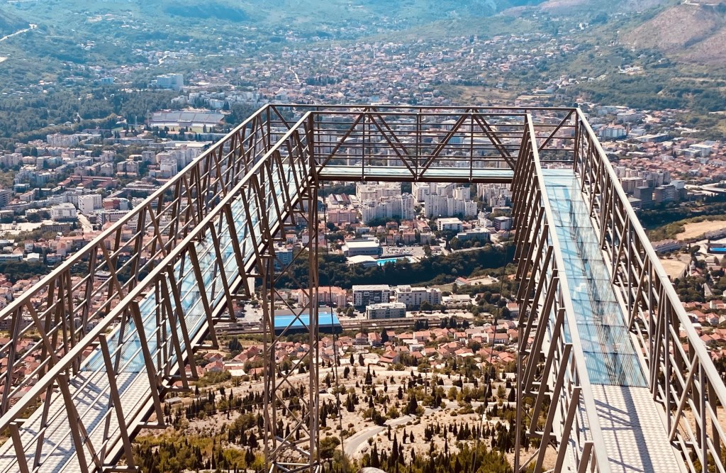 De oude stad van Mostar met de beroemde Stari Most (oude brug) trekt veel kijklustigen. Ook nu wordt de stad druk bezocht door toeristen. Veel buitenlandse reizigers maken een daguitstap vanuit hun vakantieoord in Kroatië. Ik bezocht het mooie, oude stadscentrum van Mostar al meerdere keren. Voor meer info, gebruik de zoekfunctie op de homepagina van de blog. Het is deze keer tijd voor iets anders. Ik bezoek Park Fortica in hogere regionen. Het park ligt op een 500 meter hoge heuvel ten oosten van de stad en trekt voornamelijk avontuurlijke sporters en adrenalinejunks die graag mountainbiken of wandelen op hoogte tussen de overblijfselen van Italiaanse vestingwerken uit de 2de wereldoorlog. Sinds 2018 is er de Fortica zipline met een lengte van 570 m waar avonturiers boven de stad zweven tegen een snelheid van meer dan 50 km per uur. Dat en het gloednieuwe glazen platform met een prachtig uitzicht over Mostar trekt me aan. Jammer genoeg is de zipline niet actief. Er zijn momenteel geen liefhebbers en het is wachten op enkele durfals. Eerst het glazen platform dan maar, en dat is ook niet mis. Het wandelpad op het uitkijkplatform is 35 meter lang en steunt op steunpilaren van 15 m hoog. Het panorama over Mostar is fenomenaal.