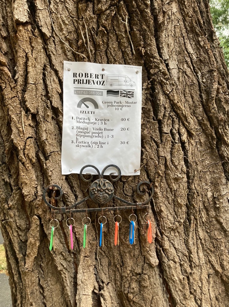 Op dag 2 gaat de route verder naar Zitomislici, slechts 18 km voorbij Mostar om me te vestigen op Autocamp Green Park (https://greenpark.ba/). Het is een leuke camping met hoge bomen die voor schaduw zorgen aan de Neretva rivier met als middelpunt het gezellige restaurant dat ’s avonds en in het weekend veelvuldig bezocht wordt door inwoners van het dorp. Het kampeerterrein en het restaurant zijn strikt gescheiden. Restaurantbezoekers mogen geen gebruik maken van het sanitair van de camping. Voor hen is een aparte ruimte voorzien. De eigenaar heeft er een speciaal systeem voor bedacht. Aan een dikke boom op het terrein hangen 7 sleutels voor de campinggasten. Ik vraag me af hoeveel sleutels er verloren gaan, maar de volgende ochtend hangt het rek tot mijn verwondering nog steeds vol. Wat een discipline!