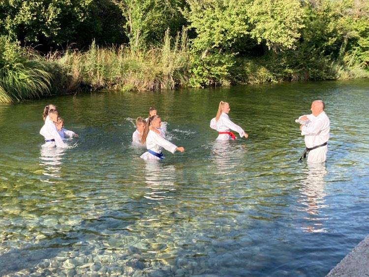 Ik vestig me voor 2 nachten op Parking Kamp Usce Trebinje op 15 km van de stad. De kleine camping met een arsenaal aan bungalows ligt naast een smalle, ondiepe rivier waar het leuk is om verkoeling te zoeken op hete zomerdagen. Naast de reguliere kampeerders zijn ook jeugdgroepen welkom. Momenteel is er een karateclub uit Servië op trainingsstage. Het is een vrolijke bedoening op het terrein. Er wordt af en toe gezongen onder begeleiding van een gitarist en de trainingen gaan wegens de hitte soms door in de rivier. Ik mag ’s avonds mee aan tafel schuiven met de bende voor 6 BAM (3 €). Het is gemakkelijk, goedkoop en lekker. De sfeer is gezellig.
