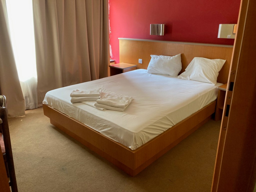 Ik rijd meteen verder naar Camping Bellevue in Skopje. Het kampeerterrein is vervallen en de poort is gesloten. De accommodatie behoort bij het naastgelegen Hotel Bellevue. Bij de receptie wacht een vriendelijk onthaal. De receptionist biedt de mogelijkheid om een bungalow te huren voor 25 €. Naast het vakantiehuis is parkeergelegenheid voor de bus. Het is een 4-persoons bungalow. Vandaag heb ik 3 slaapkamers en een privé badkamer. Dat lijkt stilaan op een grote villa.