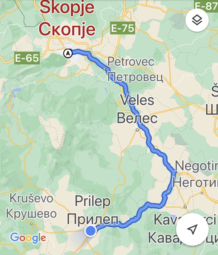De volgende halte is Prilep. De stad ligt centraal in Noord-Macedonië en is gebouwd op een plateau tussen een aantal bergen. De intentie om geen autosnelwegen te rijden, loopt al na 5 km spaak. De rijbaan die eerst een kasseiweg en daarna een grindweg wordt, belooft niet veel goeds en een voorbijrijdende mountainbiker is een teken aan de wand. De man zegt dat de off-road bergpas wel degelijk de juiste richting is en hij denkt dat het haalbaar is met de bus. Denken is niet genoeg. Ik draai voor alle zekerheid om en neem de E-75 autosnelweg. Deze snelweg gaat tot Veles zijdelings over een bergkam. Het is een tolweg, maar tegelijkertijd een mooie route. De maximum snelheid is 80 km per uur. Genieten van het uitzicht kan nog net. Vanaf Veles tot Prilep gaat het over de R1312. Deze verkeersweg is heuvelachtig zonder al te hoge toppen te scheren.