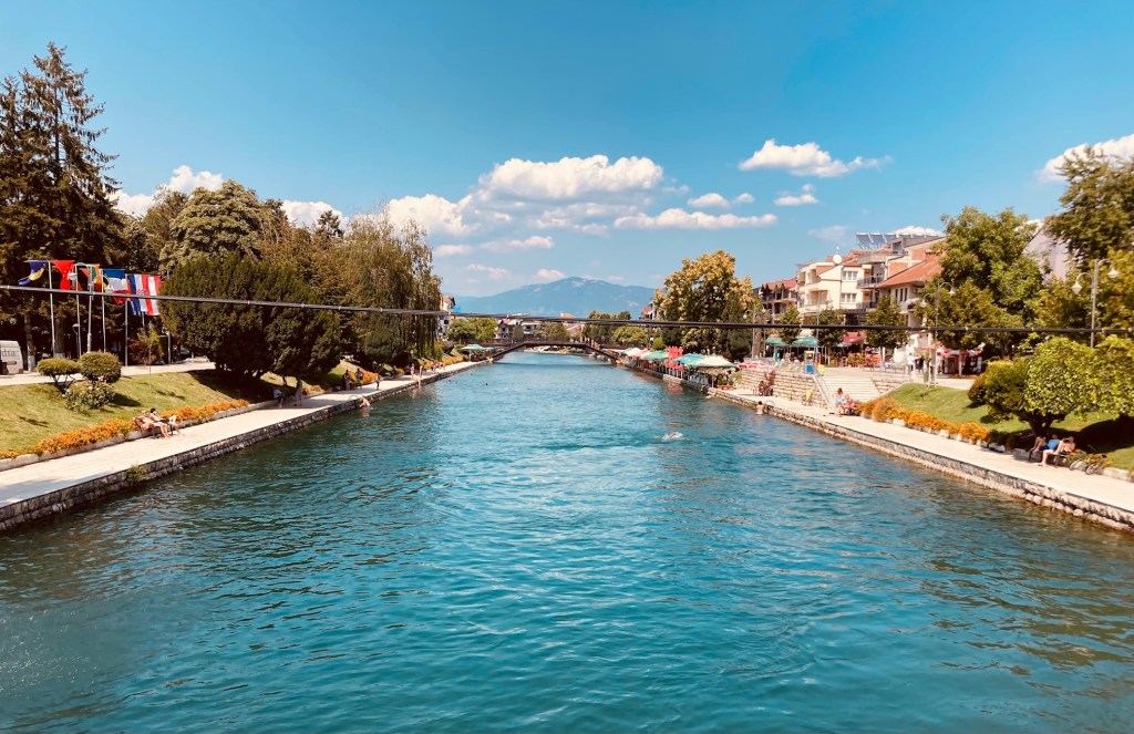 Buiten de winkelpromenade is er geen sprake van autovrije zones. Het drukke verkeer door de smalle straten is niet aangenaam. Auto’s parkeren volop op de stoep en af en toe is het nodig om snel weg te springen voor ongeduldige chauffeurs. Net wanneer ik denk dat Struga niets te bieden heeft, volgt een heerlijke ontdekking. Struga heeft een poëziepark aan de rand van het stadscentrum. Het is een groene zone aan het water, waar het meer van Ohrid uitloopt in een soort zwemkanaal. Het is een oase van rust waar families samenkomen om te ontspannen. Het park heeft zijn naam te danken aan een jaarlijks terugkerend poëziefestival dat al bestaat sinds 1961. Tijdens de lange traditie heeft Struga al 4000 dichters ontvangen uit 95 landen.
