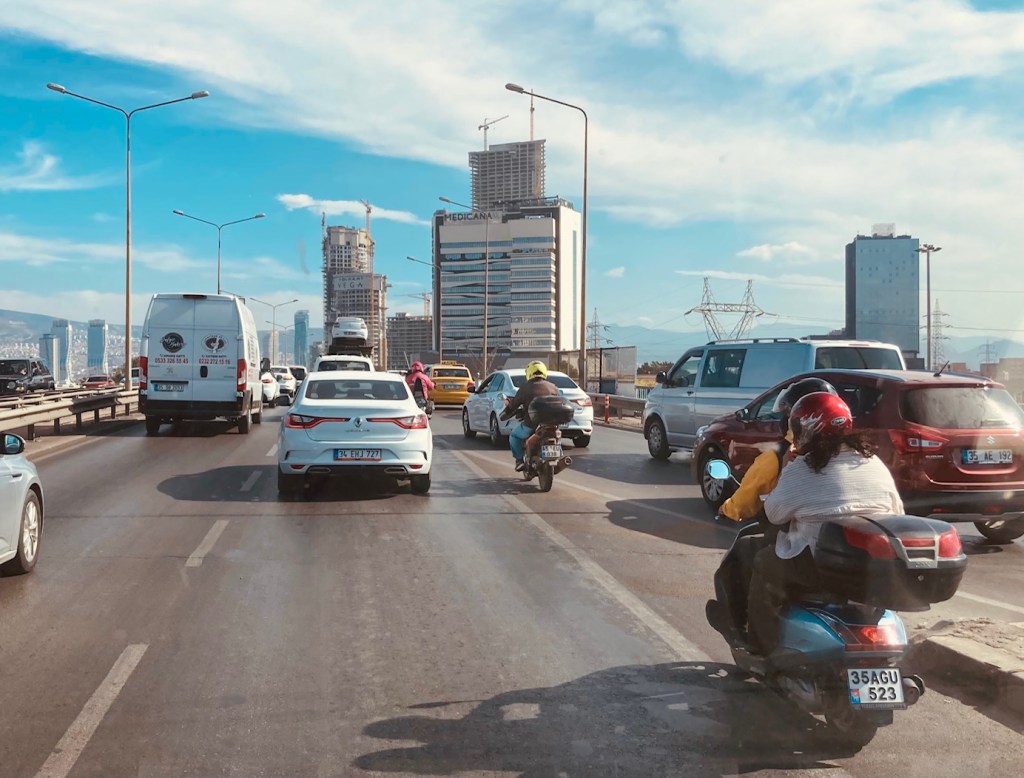 Om zonder autosnelwegen van Selçuk naar Ören te rijden, is de 3de grootste stad van Turkije de grootste hindernis. De metropool Izmir telt 2,5 miljoen inwoners. De transit gaat dwars door het centrum. Het drukke verkeer is geen lachertje. Veel tijd om rond te kijken is er niet. Mijn wonderlijke GPS is geen groot licht in het woelige verkeer. Het toestel schakelt op de meest cruciale momenten over op achteruitrijcamera zodat de te volgen route onzichtbaar wordt. Gelukkig heb ik op voorhand het parcours bestudeerd. Ouderwets de borden volgen, lukt uiteindelijk ook. Er is tijdens een filemoment zelfs tijd om een foto te nemen. Ah ja, ik mag ook een keer stoppen bij een politiecontrole om mijn rijbewijs te tonen. Voor al wie eraan twijfelt, de oude roze vod uit 2004 met een afschuwelijke pasfoto wordt zonder probleem goedgekeurd.