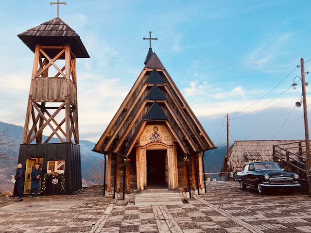 De kerk op het hoofdplein van Drvengrad
