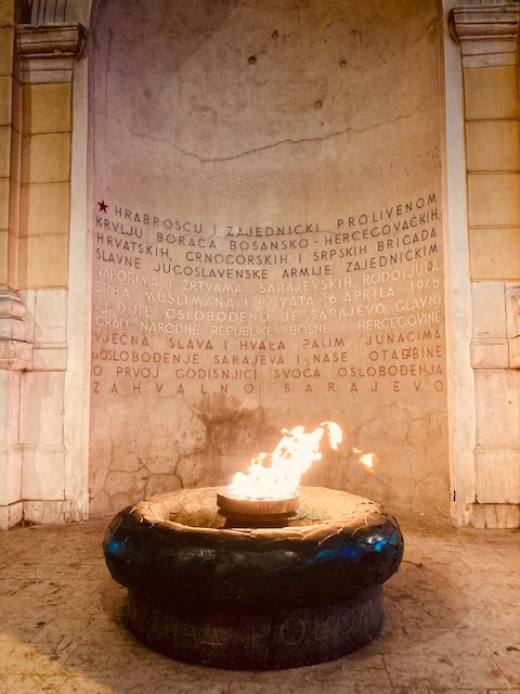 De avondwandeling leidt naar de Eeuwige vlam op de kruising van de straten Mula Mustafa Bašeskije, Titova en Ferhadija. Het monument dateert uit 1946 en herdenkt de militaire- en burgerslachtoffers van Bosnië en Sarajevo uit de 2de wereldoorlog.