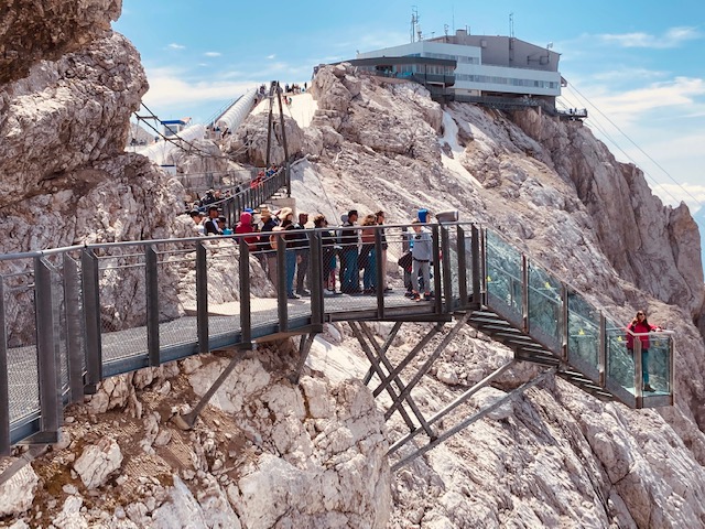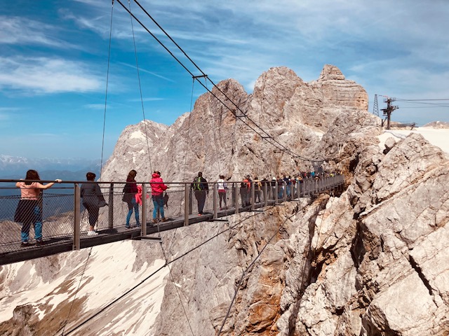 De beruchte hangbrug is 100 m lang en hangt maar liefst 366 m boven de ijsmassa. Op heldere dagen is het mogelijk om Slovenië en Tjechië te zien.
