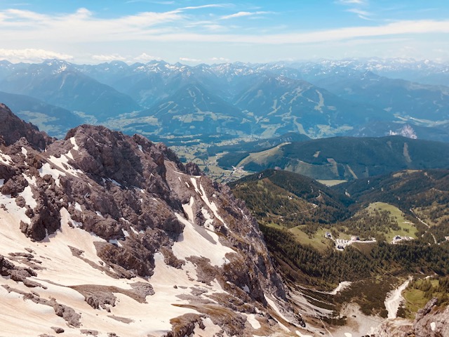 Naast de spectaculaire hangbrug zorgen ook de Treppe ins Nichts voor een adembenemende ervaring. Het uitkijkplatform bestaat uit 14 glazen trappen “naar het niets” en hangt aan de berg. De Treppe ins Nichts leiden in de eerste plaats naar een confrontatie met jezelf. Wie de tweestrijd wint en de trappen durft betreden, zweeft in het niets en geniet van het allermooiste uitzicht boven Dachstein. De file voor de trappen is lang. Het dilemma is snel opgelost. Het geduld om te wachten, ontbreekt. Ik ben tevreden met enkele foto’s vanaf de zijlijn. De beloning is sowieso een fantastisch panorama.
