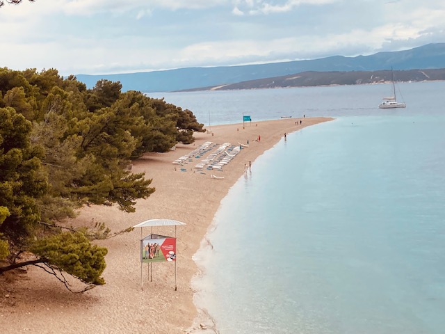 Camping NO 1 ligt 1,5 km van het stadscentrum. De weg ernaar toe gaat via een autovrije strandboulevard, afgebakend door schaduwrijke hoge bomen die vandaag als een soort paraplu fungeren. De eerste passage is het beroemde kiezelstrand van Zlatni Rat (Gouden Hoorn). De zandstrook heeft zijn naam te danken aan zijn speciale vorm die verandert naargelang de zeegetijden. Omwille van de voortreffelijke windomstandigheden is windsurfen populair. Er worden regelmatig internationale wedstrijden gehouden. Nu ligt de landtong er wat mistroostig bij omwille van de kwakkelende weersomstandigheden. De zonnekloppers en windsurfers zijn ver te zoeken.