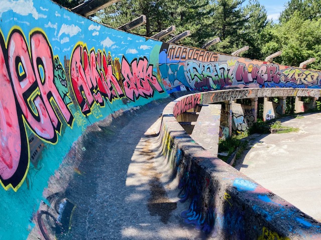 De bobsleebaan onderging in de loop der jaren een hele gedaanteverwisseling. De oorlog en de natuur deden hun werk grondig. De locatie waar in 1984 gestreden werd voor de medailles onder luid gejuich van duizenden toeschouwers is nu vergane glorie. Sommigen houden ervan, anderen vinden het afgrijselijk. Voor mij blijft het een fascinerende locatie waar atleten zich bijna 40 jaar geleden naar beneden stortten aan een waanzinnige snelheid. De met graffiti beschilderde, vervallen piste wordt nu bezocht door toeristen, al staan ze niet in dikke drommen te wachten. Een bezoek kan met de kabelbaan vanuit het stadscentrum of met de auto. Er is voldoende parking aan Hotel Pino.