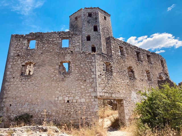 Er volgen nog heel veel trappen om het oude fort te bereiken aan de overkant. Het trappentraject is een reis doorheen de tijd die nooit verveelt. Overal is wel iets te zien. Aan de rand van de oude vesting volgt een mooi uitzicht op de Neretva vallei. Er zijn toeristen die de toren van het fort betreden, maar een plaatselijke gids raadt het af omdat de ruïnes te onstabiel zouden zijn. De toegang tot de toren vergt enige behendigheid. Ik sla het schouwspel gade en neem wat foto’s.