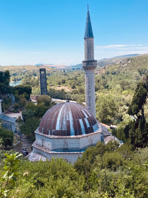 De Šišman Ibrahim Pasha moskee werd gebouwd in 1563 en stond oorspronkelijk bekend onder de naam Hadži-Alija moskee. Dat is nog te zien aan het opschrift boven de toegangsdeur. De naamsverandering kwam er in de 17de eeuw toen het gebedshuis gerenoveerd werd door ene Šišman Ibrahim Pasha. Tijdens de laatste burgeroorlog liep het gebouw opnieuw ernstige schade op. Die is inmiddels hersteld. Mijn zomerse outfit is enkel geschikt om even binnen te gluren vanop afstand. Niet zo ver van de moskee ligt de sahat kula of een 16 m hoge klokkentoren uit de 17de eeuw. Het was een observatiepost van het leger om de Neretva vallei te bewaken tegen mogelijke indringers. De klok werd tijdens de eerste wereldoorlog door de Oostenrijkers gesmolten om wapens te maken.