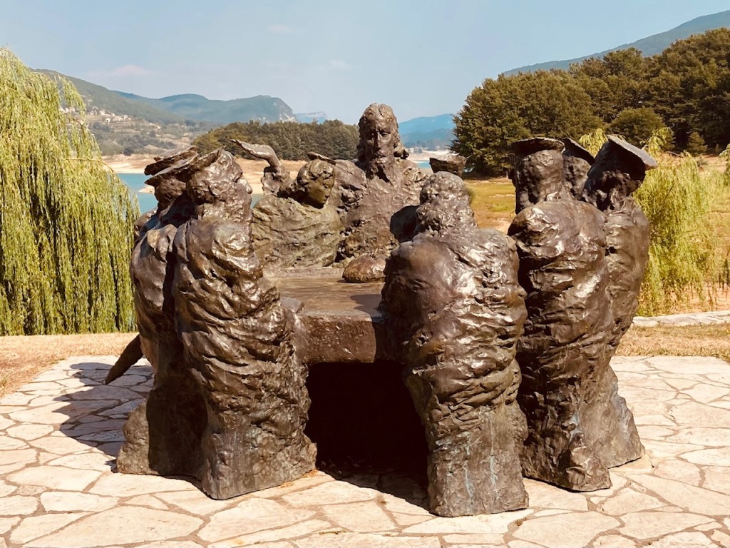 De watertemperatuur bedraagt slechts 7,5 graden. In de zomer droogt het meer gedeeltelijk op. Het een lastige opgave om het water te bereiken door de modderige oevers. Sommige zwemmers laten zich daardoor niet afschrikken. Vissen en kajakken zijn andere populaire activiteiten. Internationale roei atleten komen zich hier voorbereiden op belangrijke wedstrijden. Ik ben meer geïnteresseerd in het schiereiland Šćit dat middenin het meer ligt. Probeer vooral de naam van het dorp niet uit te spreken want het klinkt als “shit”. De accentjes op de letters bepalen de uitspraak en vermoedelijk is “shit” niet helemaal correct. Er is zowaar een kleine camperplaats met de naam Franjusic camping apartment. Het is eigenlijk een groot huis met enkele studio’s voor vakantiegangers, maar in de tuin is er plaats voor 5 voertuigen en enkele tenten. De ontvangst is zeer gastvrij. Na vijf minuten, zit ik al mee aan tafel bier, fruit en kebab te eten. Toegegeven, de combinatie is een beetje raar, maar het is een gezellig aangelegenheid.