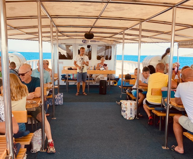 De Destina boot vaart om 8.30 uur uit met 250 mensen aan boord. Er zijn verschillende formules, waaronder een all-inclusive verfrissingspakket waarbij de hele dag door gratis drank te verkrijgen is aan de bar. Mijn ticket voorziet een vislunch met drank. Dat lijkt ruim voldoende. Aan boord wordt live muziek gespeeld door een jazztrompettist.