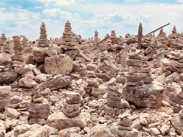 Aan de overkant van het meer is er plots een landschap waarbij stenen torentjes, gemaakt door mensenhanden de hoofdrol spelen. Het is een bizar uitzicht. Het is niet duidelijk of er een bepaalde reden is voor de aanleg. Het informatiebord op deze plek is helaas onleesbaar geworden door de vele uren zonneschijn.