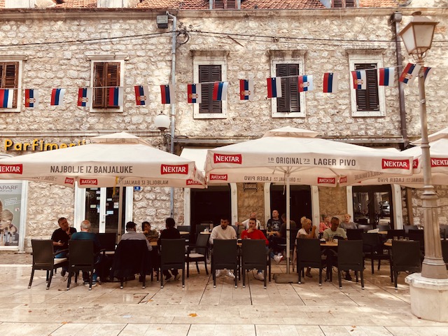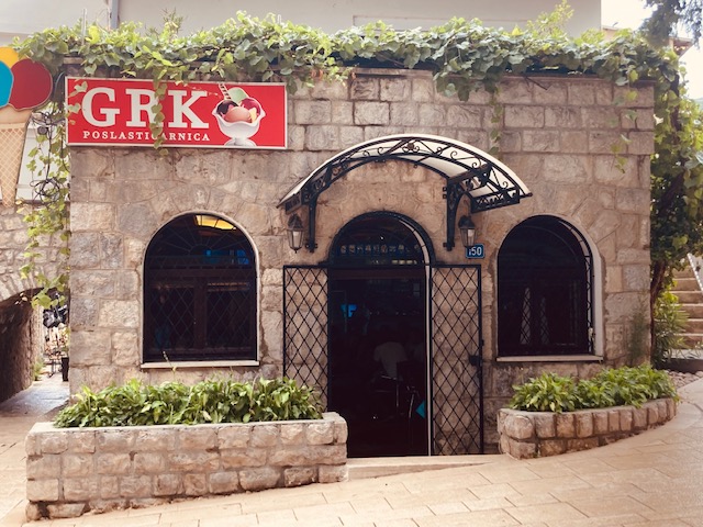 Na de lunch is het tijd voor een dessert. En waar kan dat beter dan in Kafe Poslastičarnica GRK (https://kafe-poslasticarnica-grk.business.site/?utm_source=gmb&utm_medium=referral)? De voormalige pizzeria, eveneens gevestigd in het oude stadsgedeelte Kastel gooide het roer helemaal om in 1989. De pizzeria werd omgetoverd tot patisserie. In plaats van pizza’s werd er plots huisgemaakt gebak en ijs gefabriceerd, gebaseerd op Italiaanse recepten. Het was een ingeving van het moment na een vakantie in la bella Italië. Het was meteen een schot in de roos. Meer dan 30 jaar later staan er ongeveer 60 verschillende soorten ijscoupes op het menu, tal van gebakjes en naar verluidt de lekkerste koffie. Zowel het gebak als het ijs wordt ambachtelijk gemaakt. De prijs bedraagt slechts 1 KM (0,5 €) per bol. Het is niet vreemd om een half uur in de rij te staan voor de populaire lekkernijen. Vandaag speelt het wisselvallige weer in het voordeel. Er is plaats op het terras, aanschuiven is niet nodig.