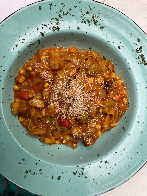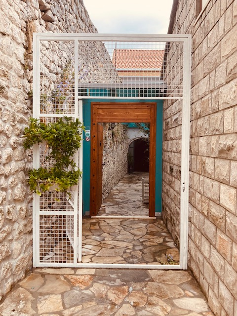 De Turkse oude stad staat bekend onder de naam Kastel en is bereikbaar via een stenen boogpoort. Kenmerkend zijn de overdekte steegjes, de stenen huizen en enkele moskeeën. Het oude centrum ligt in een “kromme” cirkel rond de Osman-pasja moskee. Sommigen noemen het een verkapte driehoek. Omdat rondjes draaien, kan zonder verloren te lopen, hou ik het bij cirkelvormig. Ondanks het mindere weer, genieten dagjestoeristen van spijs en drank op de terrassen. Om de maag te stillen, trek ik naar Restoran Humsko (https://www.pivnicahumsko.com/en/) op een ietwat verborgen locatie. De toegangspoort, gevolgd door een smalle gang leidt naar een overdekt terras om vervolgens in een gezellige ingerichte benedenverdieping met dikke muren te eindigen. Het is een klein doolhof. Het buitenterras ligt aan de voorzijde naast de oude stadsomwallingen met zicht op de rivier. Het gebouw was 200 jaar in het bezit van dezelfde familie en werd enkele jaren geleden van de hand gedaan waarna de eigenaars van Restoran Humsko er een renovatieproject van maakten. De dienstdoende kelner vertelt dat zo’n huis kopen een buitenkans is in dit stadsgedeelte. Vaak blijven historische panden generaties lang binnen dezelfde families. De kelderverdieping dateert nog uit het Ottomaanse tijdperk. Het eethuis is een ontmoetingsplaats voor liefhebbers van ambachtelijke bieren en specialiteiten uit Herzegovina. Het gevarieerde menu heeft ook een aanbod voor vegetariërs. De keuze valt op een veggie pasta met veel groenten. Het is een smakelijk gerecht.