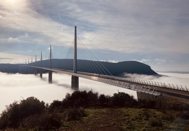 Om Catalonië te bereiken, moet er gereden worden. Hoewel gewone wegen de voorkeur hebben, volgt er toch een stuk autosnelweg. Dat heeft een speciale reden want ik heb het viaduct van Millau nog nooit van kortbij gezien. Het toltarief bedraagt 14,20 €, maar dan heb je ook wat. De bijzonder mooie brug overspant het dal van de Tarn waardoor het verkeersknooppunt op weg naar het zuiden dwars door het centrum van de stad Millau ontlast wordt. De constructie werd in 2004 officieel geopend door toenmalig president Jacques Chirac. Op de autosnelwegparking “Aire du Viaduc de Millau” is er niet alleen een fantastisch uitzichtpunt, maar ook een gratis tentoonstellingsruimte met informatie over de overspanning en de omgeving. Het viaduct van Millau is 2460 m lang en de hoogste waaierbrug ter wereld. De hoogte van de brugpijlers varieert tussen 77,56 m en 244,96 m. Kenmerkend voor waaierbruggen of tuibruggen zijn de pijlers waarbij aan elke pijler een stuk brugdek wordt opgehangen aan dikke kabels. Om van het indrukwekkende uitzicht te genieten is er een stijgend wandelpad van 450 m vanaf de snelwegparking. De brug is vandaag helemaal omgeven door mist en dat zorgt voor een mysterieuze aanblik.