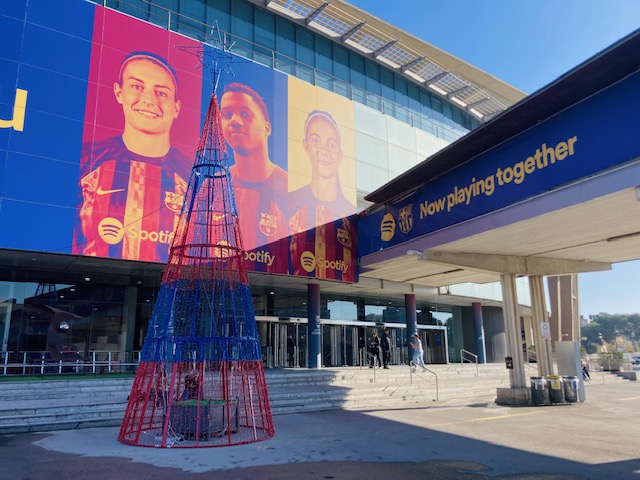 Het voetbalstadium van FC Barcelona heet tegenwoordig Spotify Camp Nou. Het is het grootste stadium van Europa met bijna 100.000 plaatsen. Dat is verwonderlijk genoeg niet te zien aan de buitenkant. Aangezien de club niet in de hoogte mocht uitbreiden, deden ze dat in de diepte. Voor rondleidingen zijn online tickets beschikbaar op het wereldwijde web voor minimum 28 €. Tijdens de stadiumtour maak je o.a. kennis met de persruimte, het clubmuseum, de spelerstunnel, de kleedkamers, de tribune en het veld. Er zijn ook hier geen tickets meer verkrijgbaar. De bedrijvigheid rond de voetbaltempel is enorm. Aan de ingang staat een standbeeld van voetbalicoon Johan Cruyff. Hij was tijdens zijn carrière 5 jaar lang speler van de club en daarna gedurende 8 jaar trainer. Er zijn een paar zones waar iedereen naar binnen mag. Zo is de winkel met merchandising vrij toegankelijk. Er is een heel gamma prullaria te verkrijgen in de clubkleuren van FC Barcelona. De officiële Barça shirts met de namen van de clubspelers behoren tot de favoriete hebbedingen. Het is zelfs mogelijk om je eigen of een andere naam en rugnummer te laten afdrukken op een onbedrukt shirt. Het personeel van de drukkerij op de benedenverdieping van de winkel, werkt de hele dag onafgebroken om de fans zo snel mogelijk te bedienen. De wachttijd is amper 20 minuten.