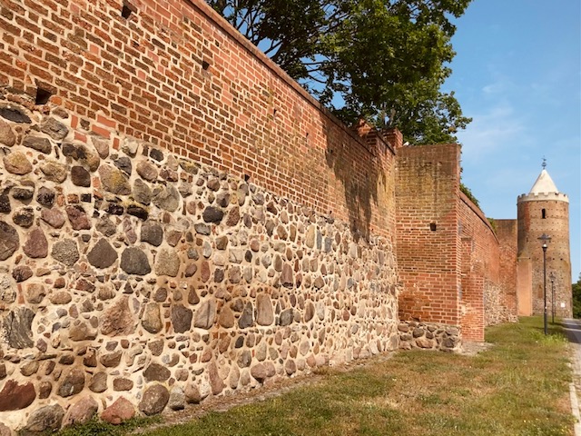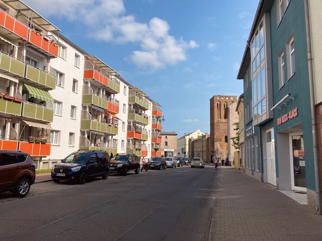 Het is bizar om her en der gerenoveerde restanten te ontdekken van een middeleeuwse stadsomwalling, oude stadspoorten en torens, kerken en zelfs een voormalig dominicanenklooster naast grote doorgangswegen, tussen smakeloze appartementsblokken die waarschijnlijk kenmerkend waren voor de Oost-Duitse bouwstijl van weleer. Hier en daar is wat kleur toegevoegd. Dat maakt het uitzicht vrolijker. Een stadsverkenning zorgt voor plotse wendingen. Een prachtig met kasseien geplaveid wandelpad naast de oude stadsmuur verandert ineens in een drukke rijbaan met min of meer hedendaagse betonblokken. De geschiedenis leert dat Prenzlau op het einde van de Tweede Wereldoorlog helemaal van de kaart geveegd werd en dat verklaart misschien het een en ander. Alhoewel de historische bouwwerken stuk voor stuk mooi gerestaureerd werden, blijft er van de oude stadsstructuur niet veel over. Prenzlau lijkt vandaag een kakofonie tussen oude en nieuwe bouwstijlen.